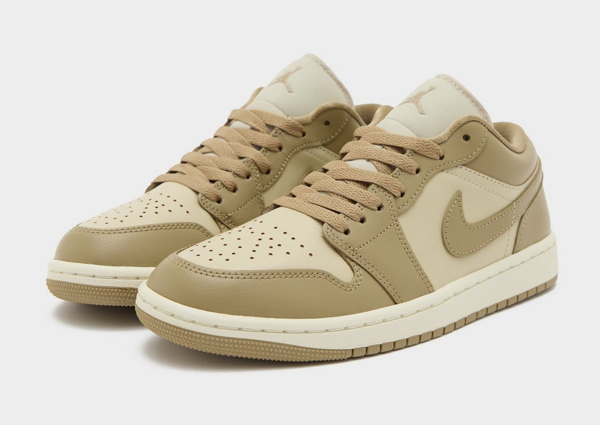 Light brown, beige colored Nike Jordan 1 Low sneakers, lace-up. Model Features Wings logo on the heel Stitched Swoosh design Perforated toe Foam midsole Rubber outsole 61% Leather, 39% Synthetic